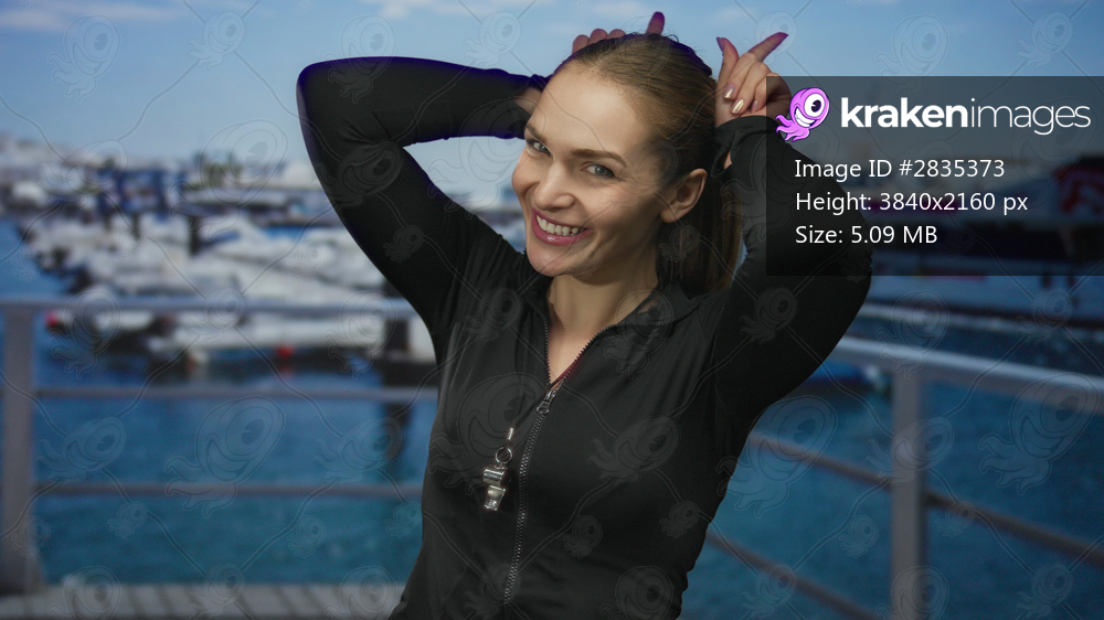 Woman with whistle holds index fingers behind head at seaside pier overlooking moored boats; playfulness.