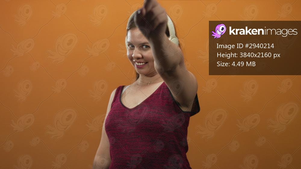 Woman with white overear headphones smiling with exposed shoulder and necklace in orange studio; playful contentment.