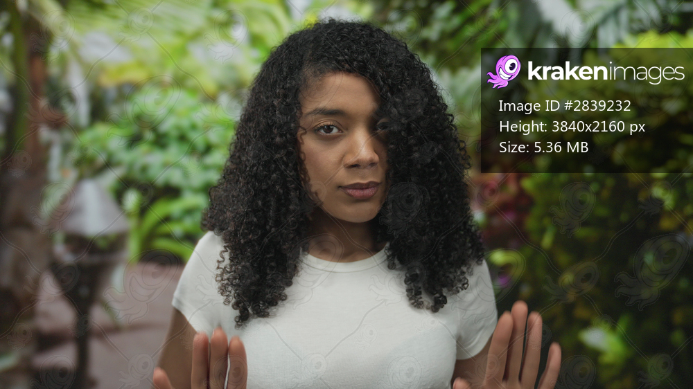 Woman with white shirt opens mouth under dappled sunlight in park surrounded by vibrant foliage; serenity calm reflection.