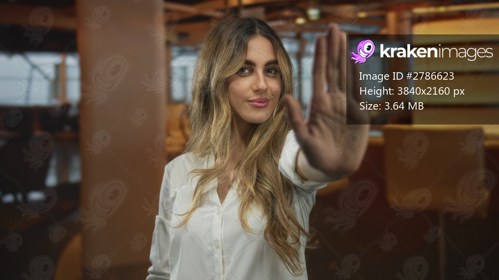 Woman with white shirt raised hand palm out for stop in spacious airport lounge; assertion boundary confidence.