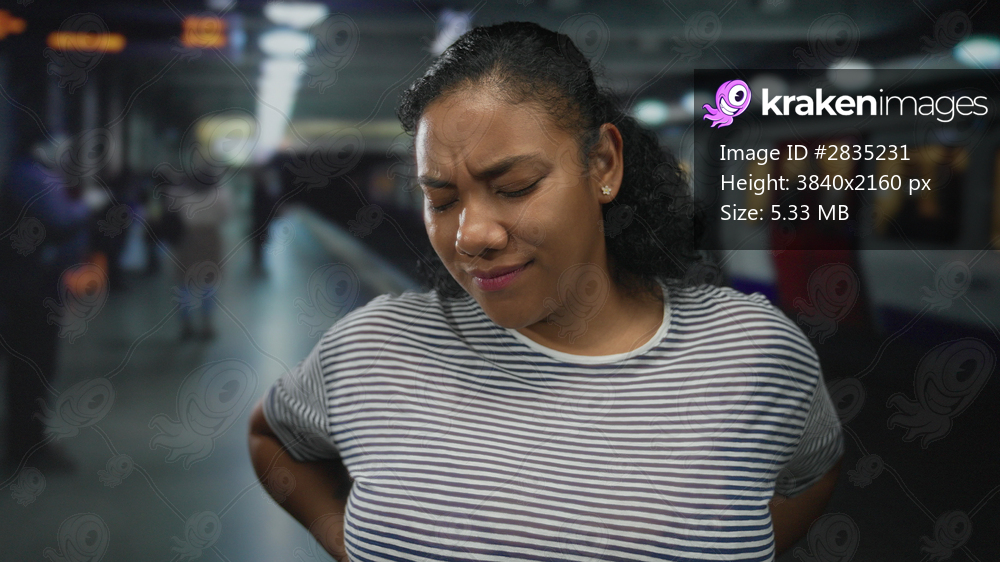 Woman winces beside train on a busy crowded train station platform during morning commute; discomfort.