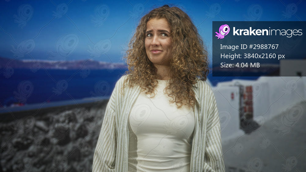 Woman wincing with closed eyes showing bust and striped cardigan on a seaside street with whitewashed walls and ocean view; melancholy travel reflection. - Kraken Images