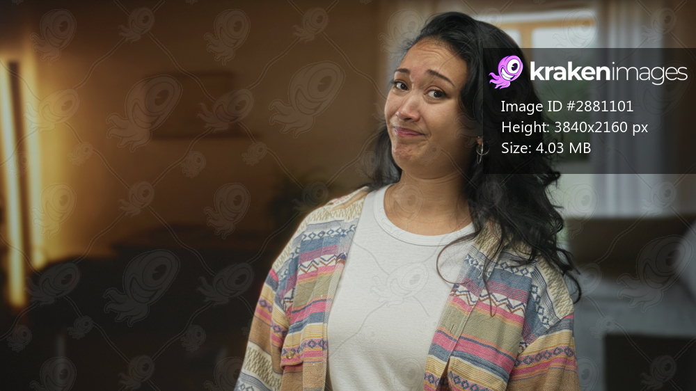 Woman wincing face with tilted head in a living room building, shoulders visible wearing patterned sweater; unease.