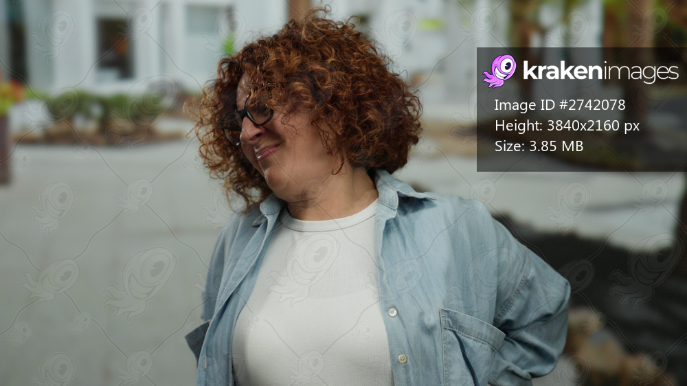 Woman wincing in pain on city street, dressed casually in blue and white, outdoor urban scene, with curly hair and glasses, middle-aged hispanic in discomfort. - Kraken Images