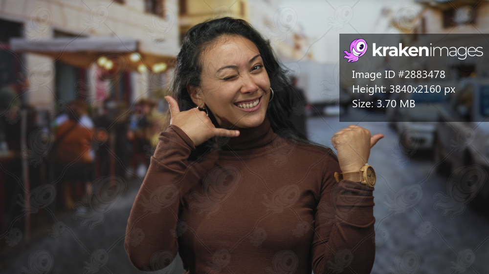 Woman winking and making call me hand gesture on a street terrace outside a restaurant, smiling and pointing thumb; playful confidence.