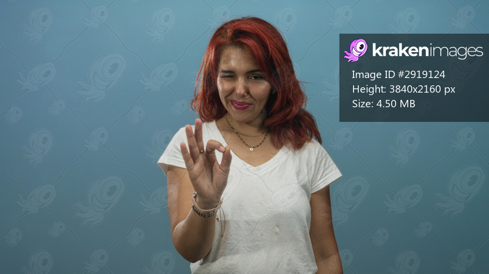 Woman winking and making ok hand gesture with visible right hand and wearing a white t shirt in a blue studio; approval assurance.