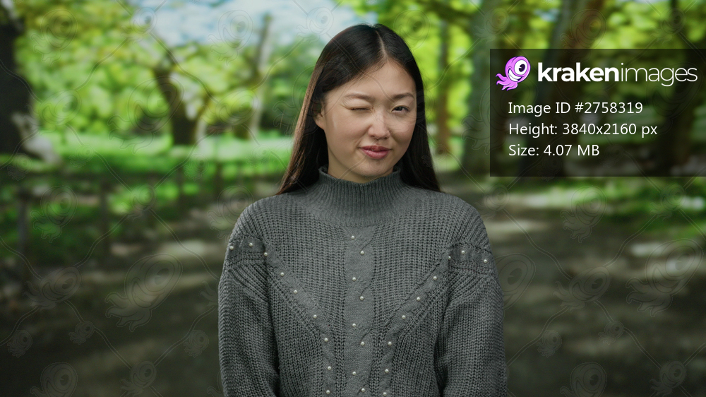 Woman winking playfully with long hair and smiling expression wearing sweater outdoors in lush green park on sunny day