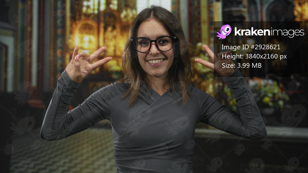 Woman winking and showing peace sign in church building wearing glasses and gray top; joy youth celebration.