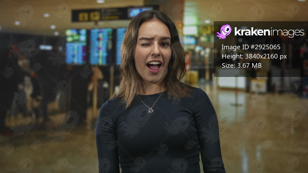 Woman winking and smiling with heart pendant necklace visible, front facing pose at airport terminal with departure boards and check in desks; travel optimism playful. - Kraken Images