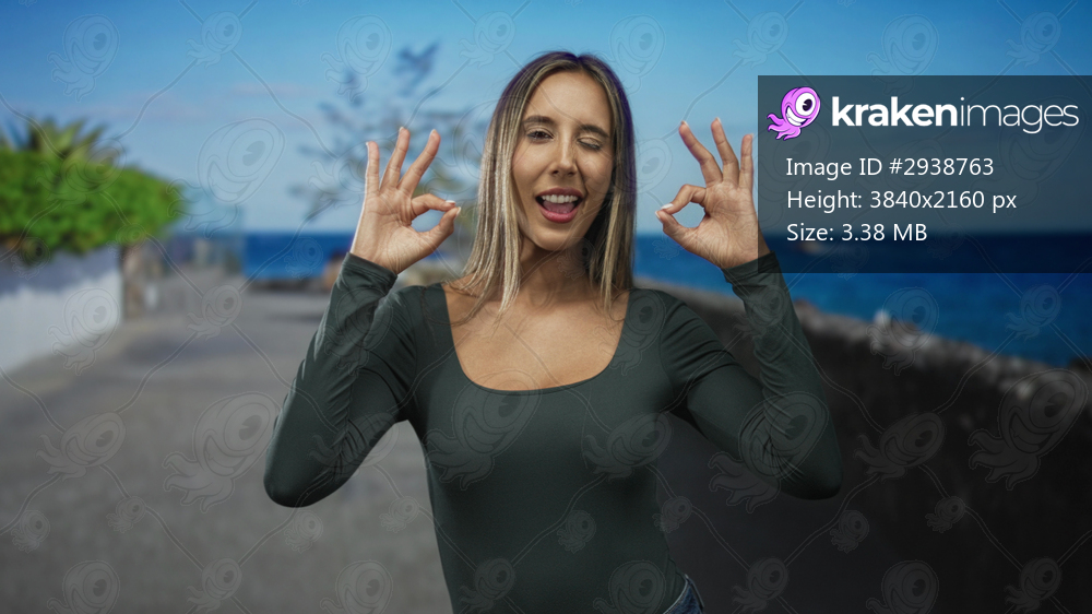Woman winking and sticking tongue out while making ok sign with both hands on a seaside promenade street, relaxed cheeky expression; playful.