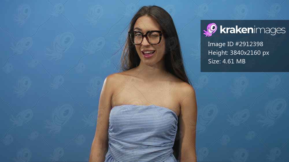 Woman winking, wearing large glasses and a striped strapless top showing bare shoulders and collarbone in studio; playful confidence.