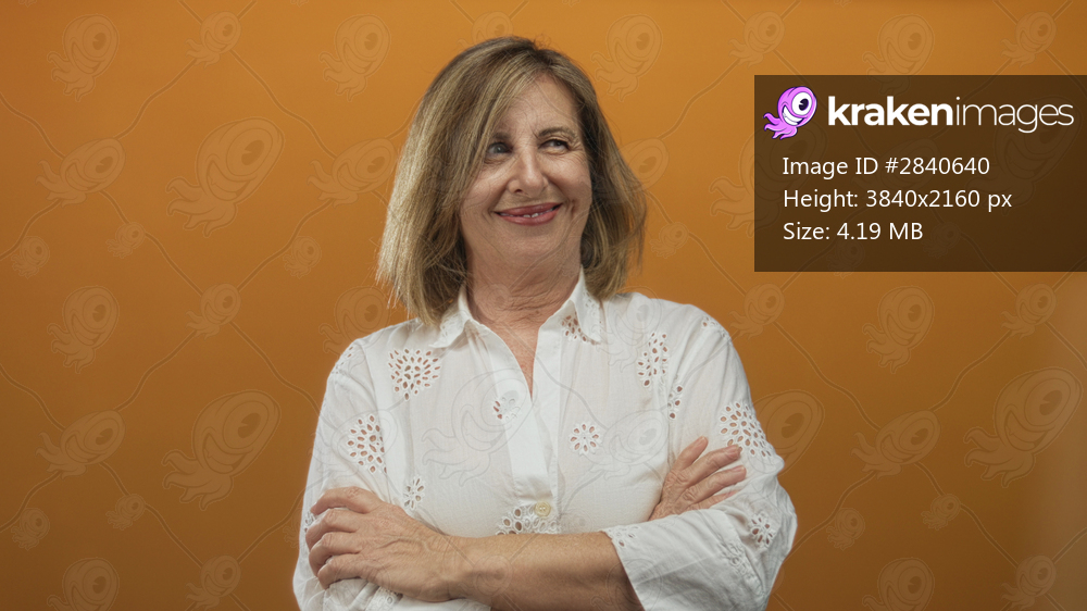 Woman winks with crossed arms in orange studio wearing casual white blouse and bare forearms; confidence.