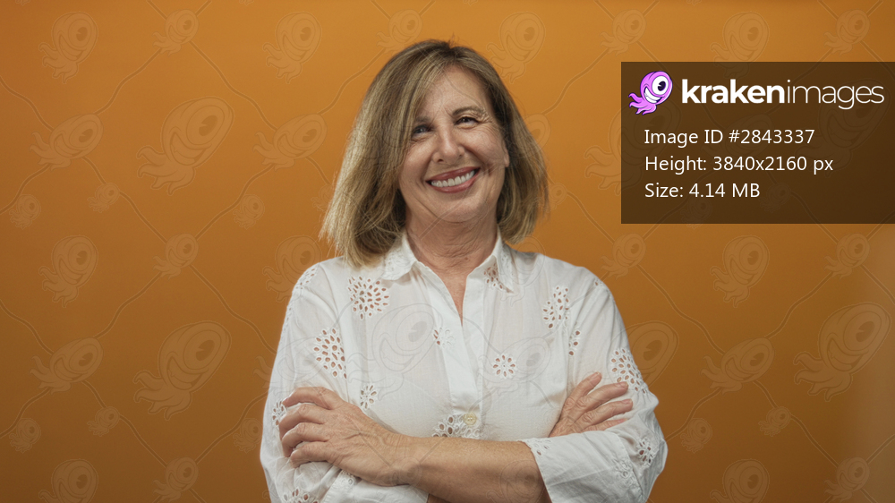 Woman winks with crossed arms in orange studio wearing casual white blouse and bare forearms; confidence.