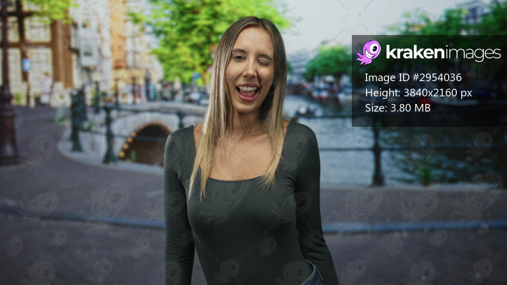 Woman winks with tongue out on street by amsterdam canal, young hispanic blonde in fitted long sleeve top with exposed shoulders; playful travel memory. - Kraken Images