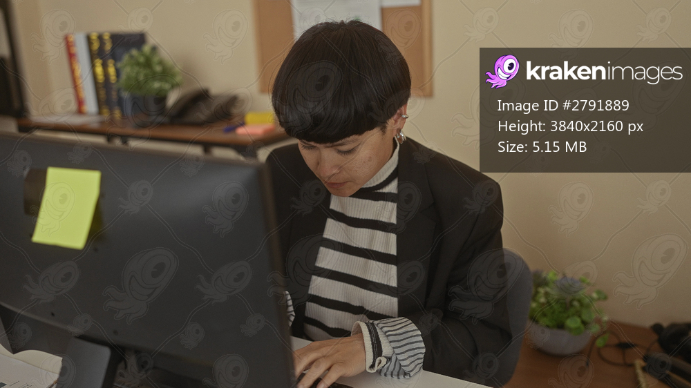 Woman working at a computer in an office setting, focused and intent in a modern workplace environment with plants and office supplies around her desk. - Kraken Images