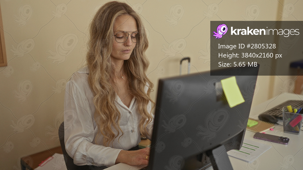 Woman working at a desk in an office with a computer, wearing glasses, long blonde hair, and a white shirt, surrounded by office supplies in an interior workspace setting. - Kraken Images