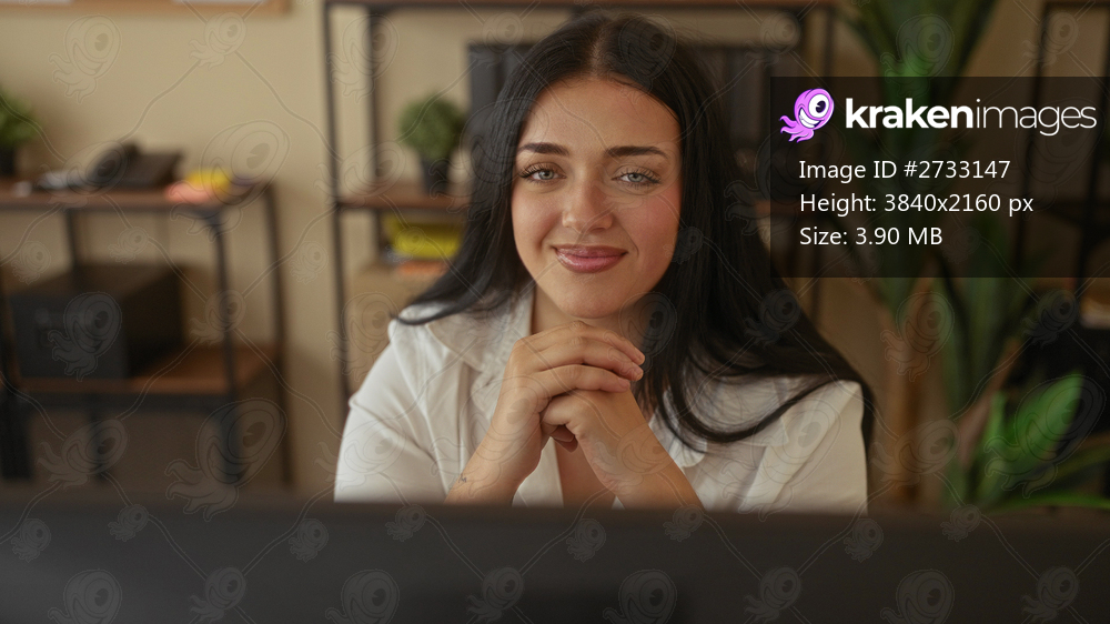 Woman working in a modern office setting with plants and shelves, looking thoughtful and smiling, interior has a relaxed ambiance featuring organized workspace. - Kraken Images