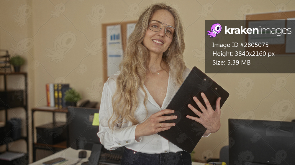 Woman working in an office holding clipboard with charts in background showcasing a professional modern workplace environment