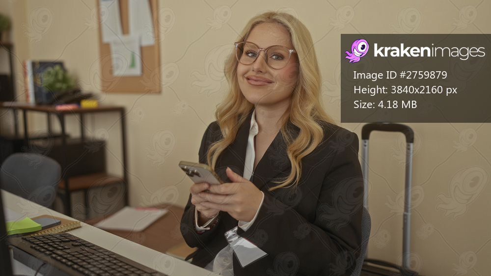 Woman working in an office using smartphone wearing glasses and a black suit sitting indoors with a suitcase in the background suggesting a business environment - Kraken Images