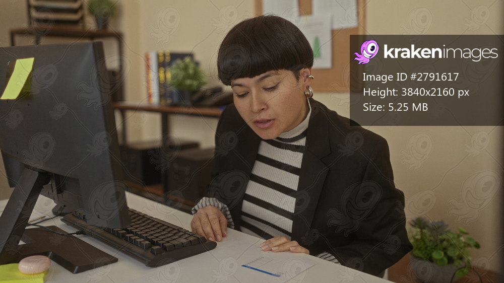 Woman working in an office wearing a striped sweater and blazer, with a computer and desk in focus, surrounded by books and plants on shelves, creating a productive atmosphere. - Kraken Images