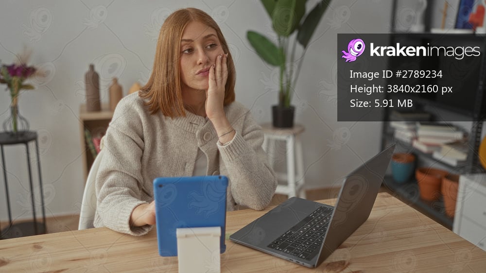 Woman working in cozy home interior with laptop and tablet, featuring a young blonde female in a living room setting, depicting modern lifestyle and indoor comfort. - Kraken Images