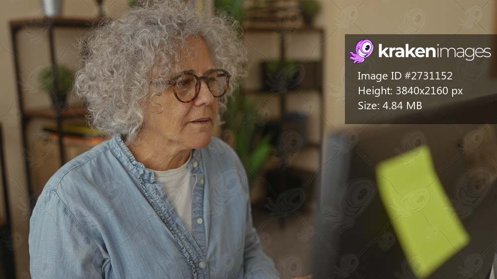 Woman working in office with grey hair and glasses, focused on computer screen, surrounded by indoor plants, conveying a modern workspace environment.
