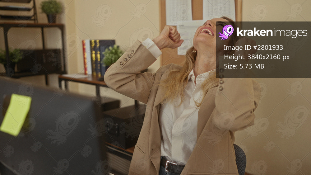 Woman working in office setting smiles and celebrates success at computer in professional workplace environment.