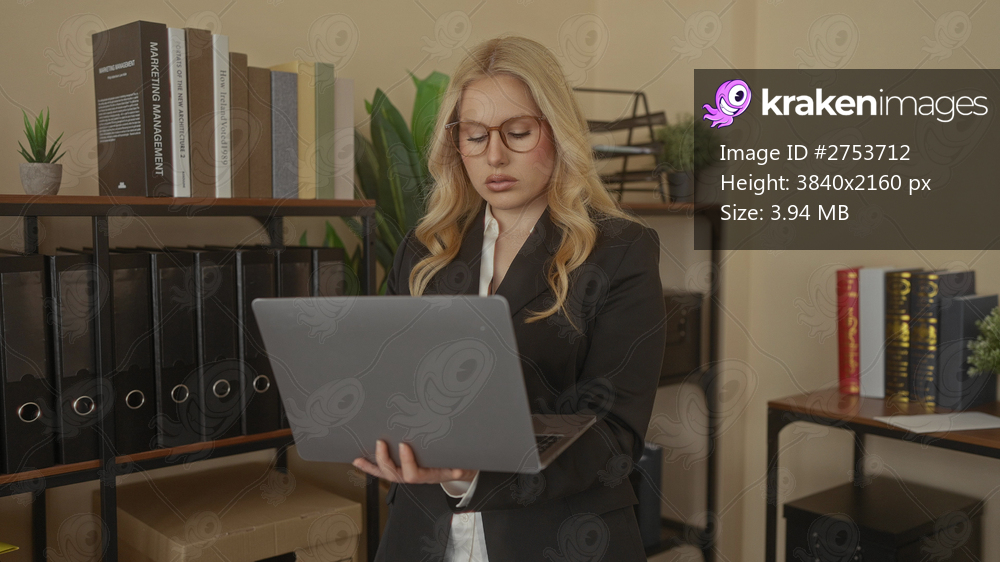 Woman working on a laptop in a modern office setting with bookshelves and business attire, showcasing a professional and focused atmosphere.