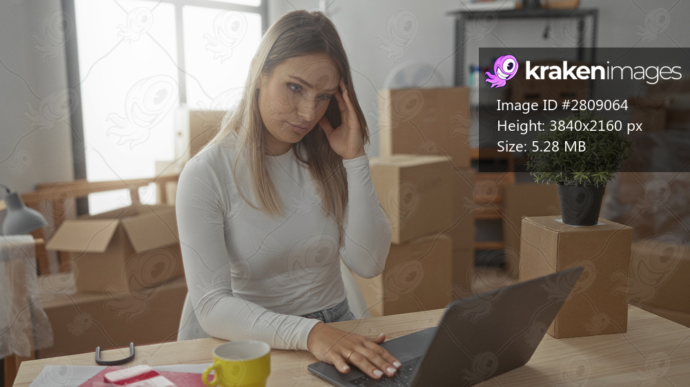 Woman working on laptop in new home surrounded by moving boxes and plants in living room environment with natural light and modern interior design.