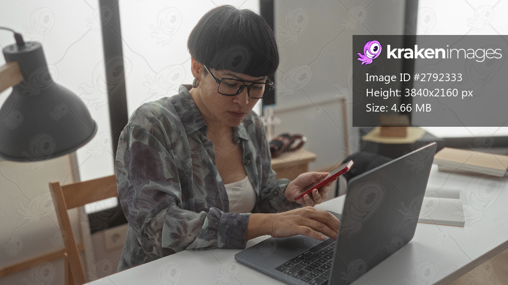 Woman working on laptop while checking smartphone in modern living room setting at home.