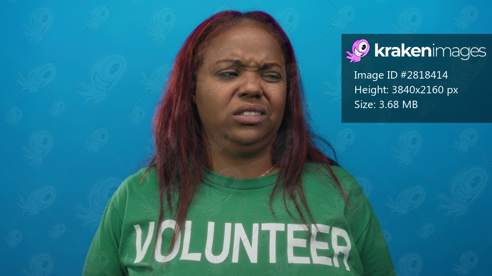 Woman wrinkles nose and frowns in a blue studio wearing a green volunteer shirt; disgust discomfort.