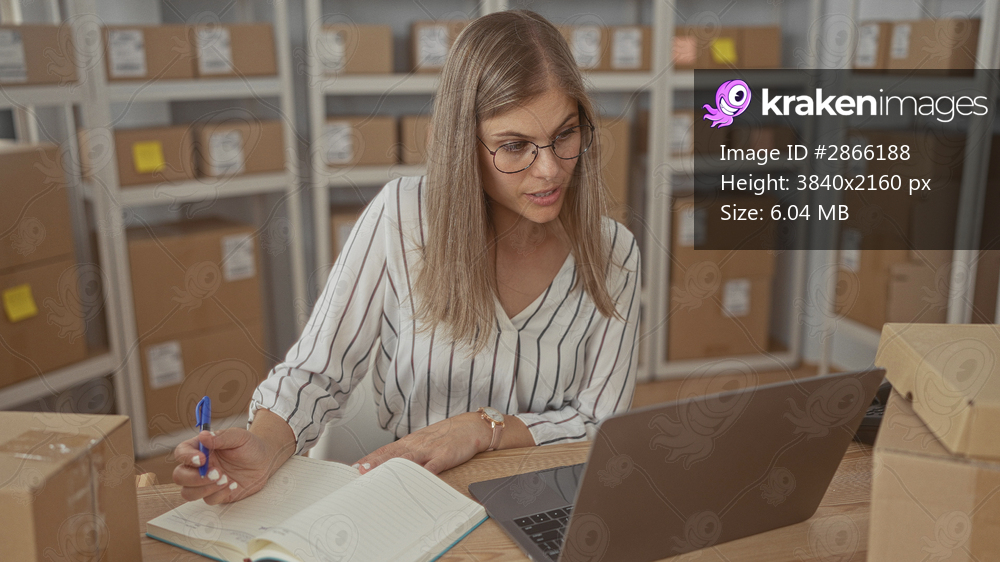 Woman writes in notebook beside stacked cardboard packages on wooden table inside storage building; efficiency concentration.