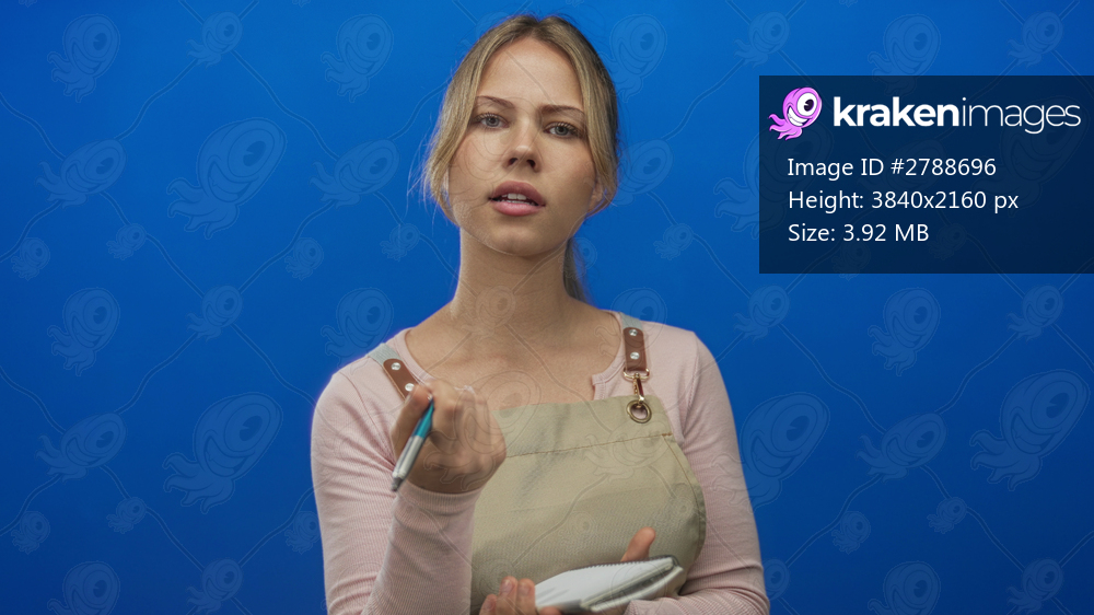 Woman writes in notepad holding pen in blue studio for note taking and jotting ideas; focus planning.