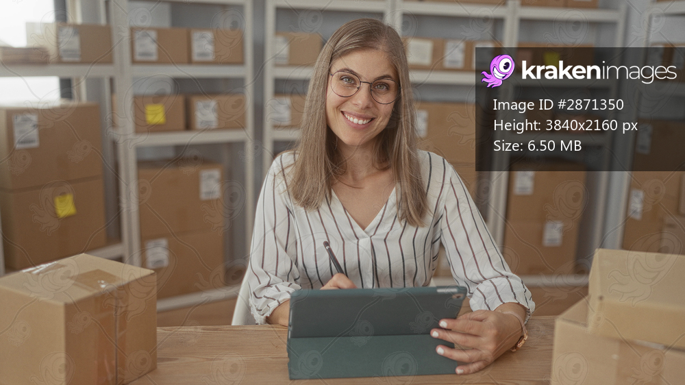 Woman writes on tablet with stylus beside stacked cardboard boxes on metal shelf in building workspace; focus.