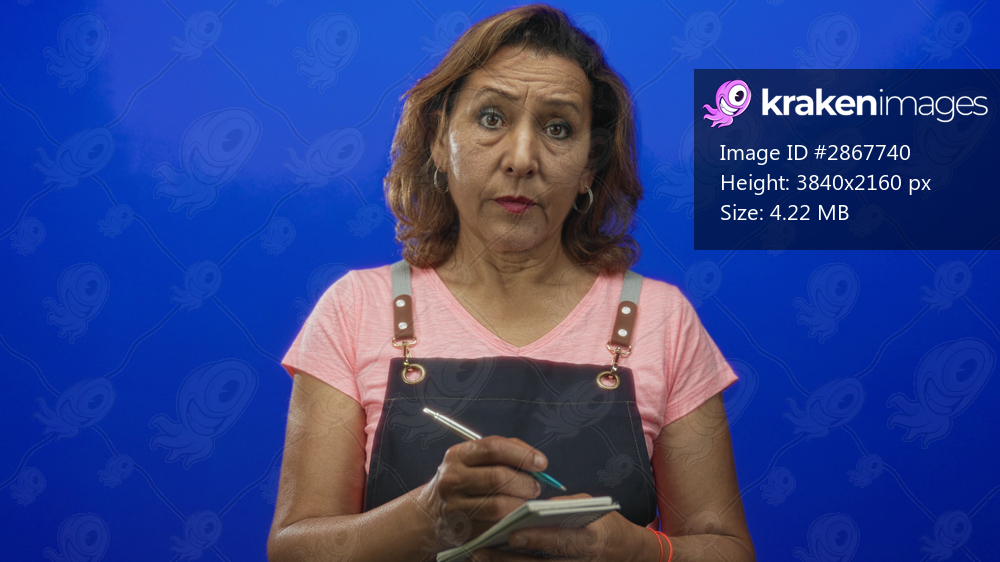 Woman writing detailed notes in notepad with pen in blue studio setting; focus concentration mindfulness clarity.