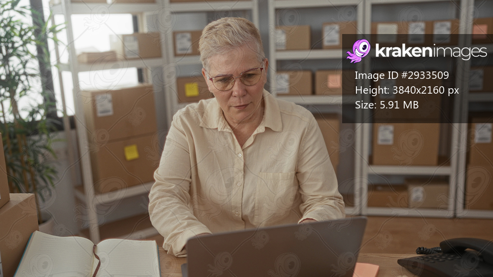 Woman writing in notebook with pen at desk beside stacked parcel boxes and laptop in building sorting shipments and checking labels; productivity.
