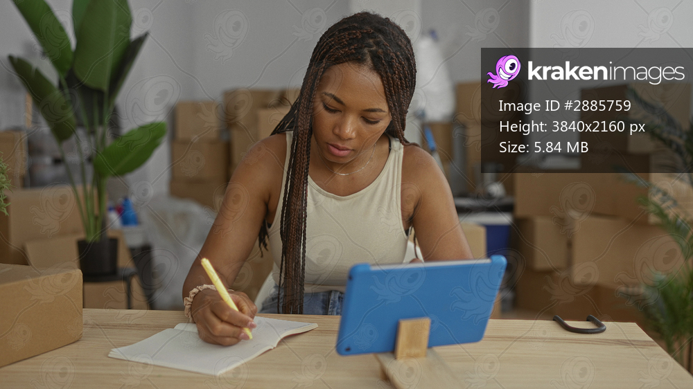 Woman writing in notebook with pen beside a tablet on table in building; small business planning focus.