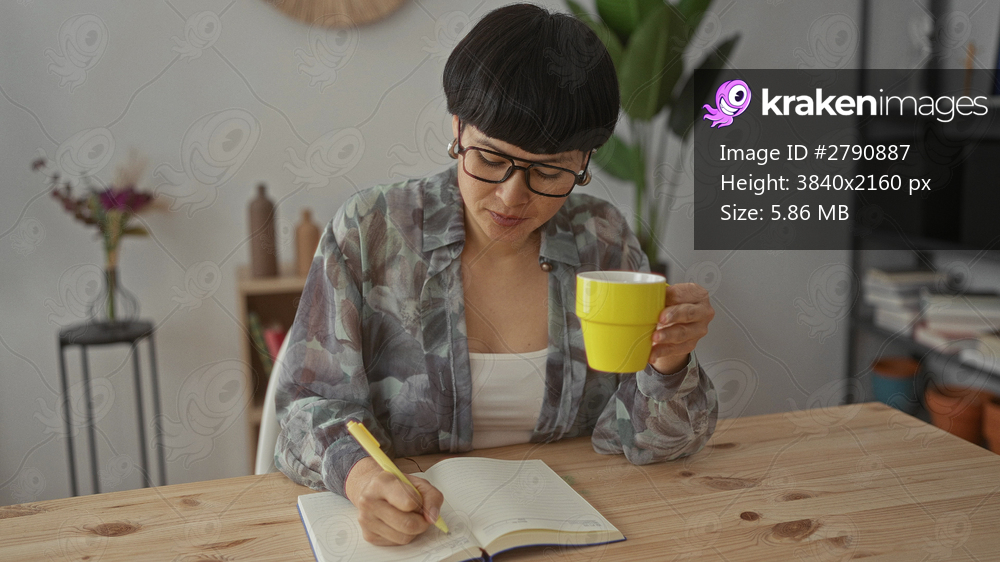 Woman writing notes in living room holding yellow cup showcasing thoughtful creative moment indoors home setting
