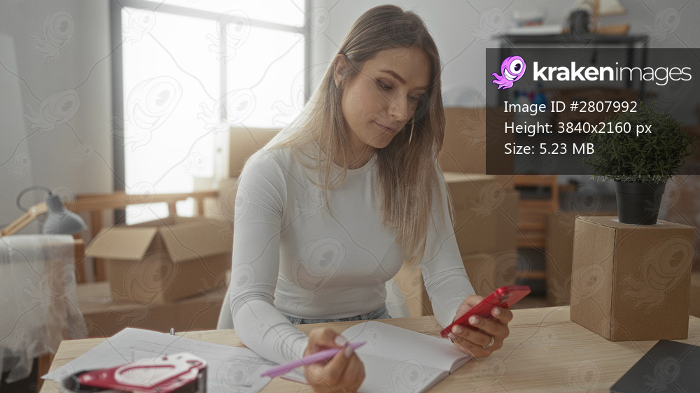 Woman writing notes while using phone in new home surrounded by moving boxes and a potted plant on wooden table.