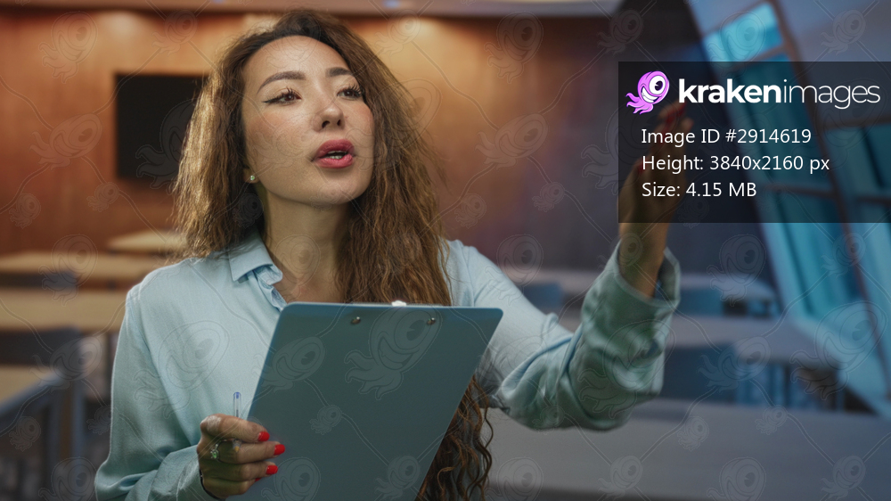Woman writing on clipboard in classroom, biting lip and holding pen while checking notes and gesturing with hand; concentration.