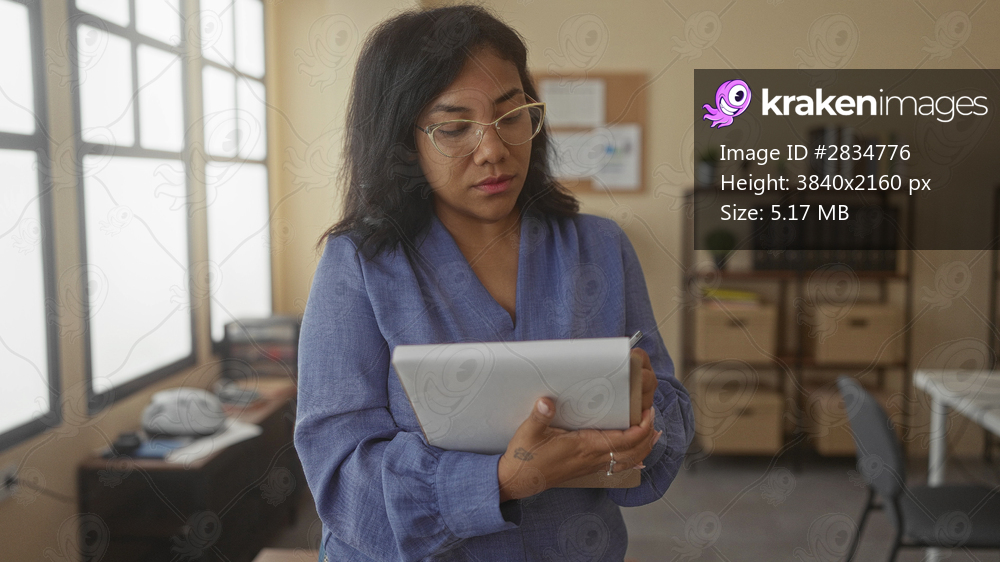 Woman writing on notepad in bright office by window with shelves and cardboard boxes behind; concentration.