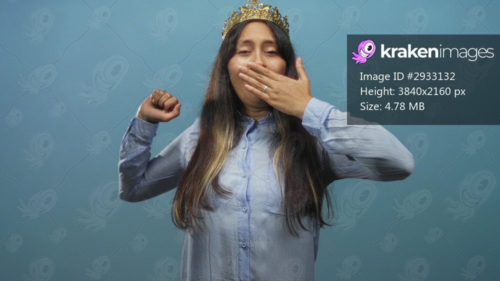 Woman yawning with hand over mouth and stretching arms wearing a gold crown in blue studio; sleepy rest relaxation.