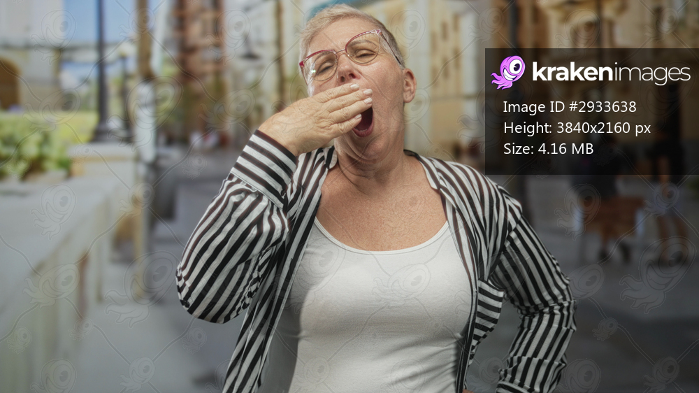 Woman yawning with hand over mouth wearing glasses and striped shirt on a street with buildings; urban fatigue.