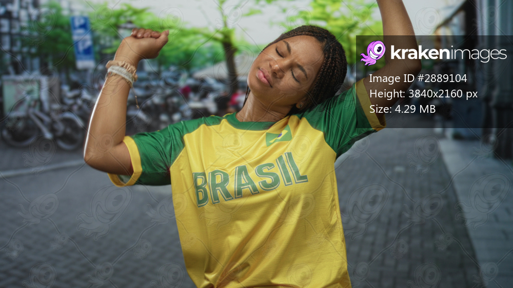Woman yawning with hand to mouth on city street wearing yellow brazil jersey with flag emblem; fatigue rest.
