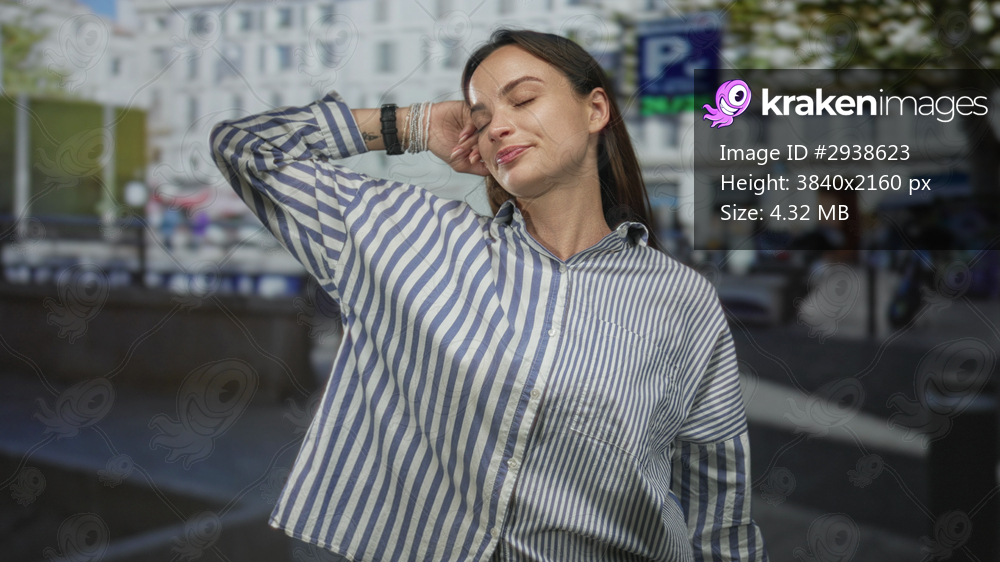 Woman yawning with hands covering mouth on a city street near a parking sign and scooters, striped shirt visible; sleepiness morning routine.