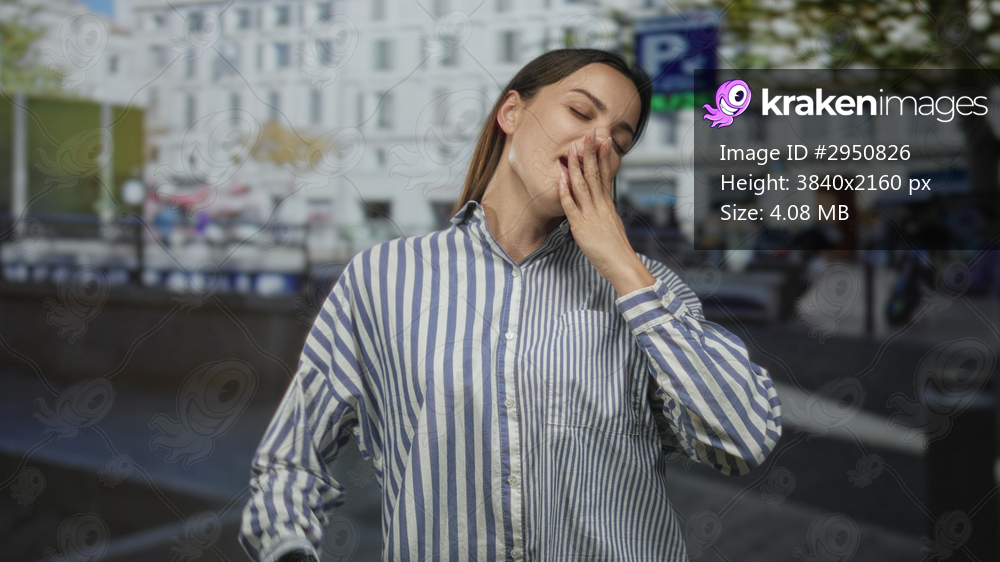 Woman yawning with hands covering mouth on a city street near a parking sign and scooters, striped shirt visible; sleepiness morning routine.