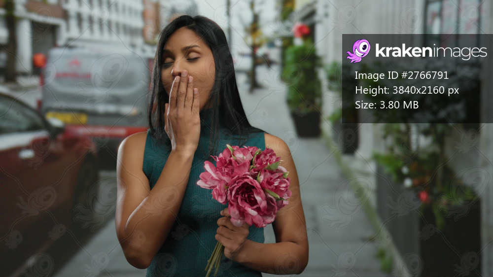 Woman yawning outdoors with pink flowers on city street showcasing relaxed urban setting.