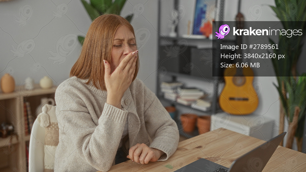 Woman yawning and stretching wearing casual sweater sitting at wooden desk in cozy living room with guitar plant and books creating relaxed home atmosphere - Kraken Images