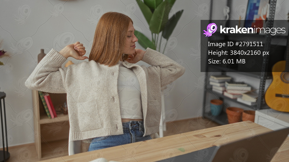 Woman yawning and stretching wearing casual sweater sitting at wooden desk in cozy living room with guitar plant and books creating relaxed home atmosphere - Kraken Images