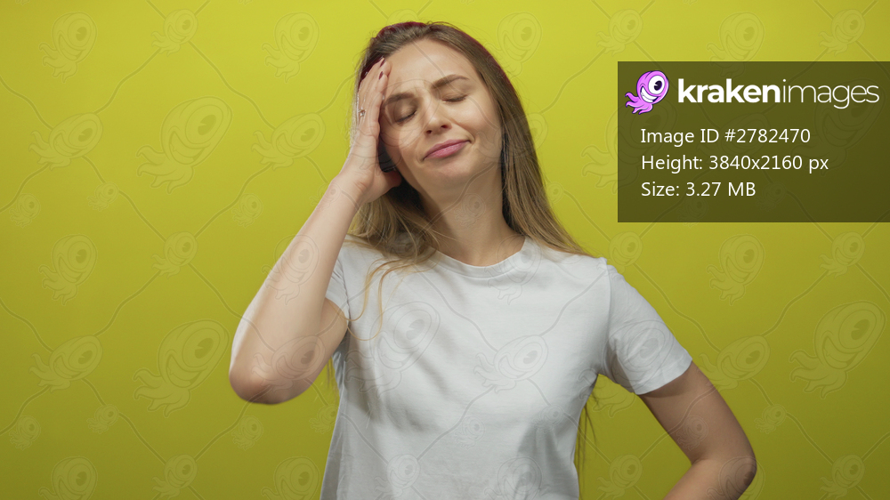 Woman yawning tiredly with a sleepy expression against a vibrant yellow background suggesting fatigue and drowsiness in a simple casual setting.